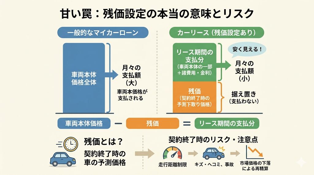 • カーリースの月額料金が安い理由と、その裏に潜む「残価設定」の本当のリスク