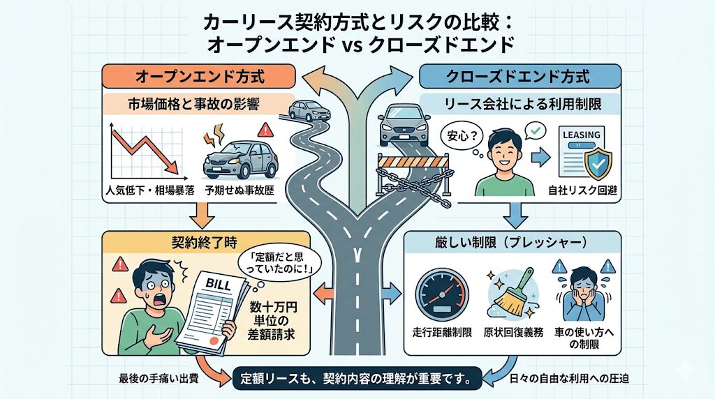 残価の精算方式には大きく分けて次の2つの方式があり、それぞれ違うリスクが隠れています。