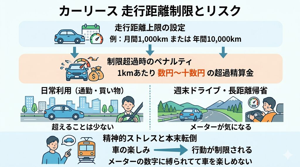 ほとんどのカーリースには、「月間1,000kmまで」あるいは「年間10,000kmまで」といった走行距離の上限が設定されています。契約満了時にこれを超過していた場合、1kmあたり数円から十数円のペナルティ(超過精算金)が課されます。