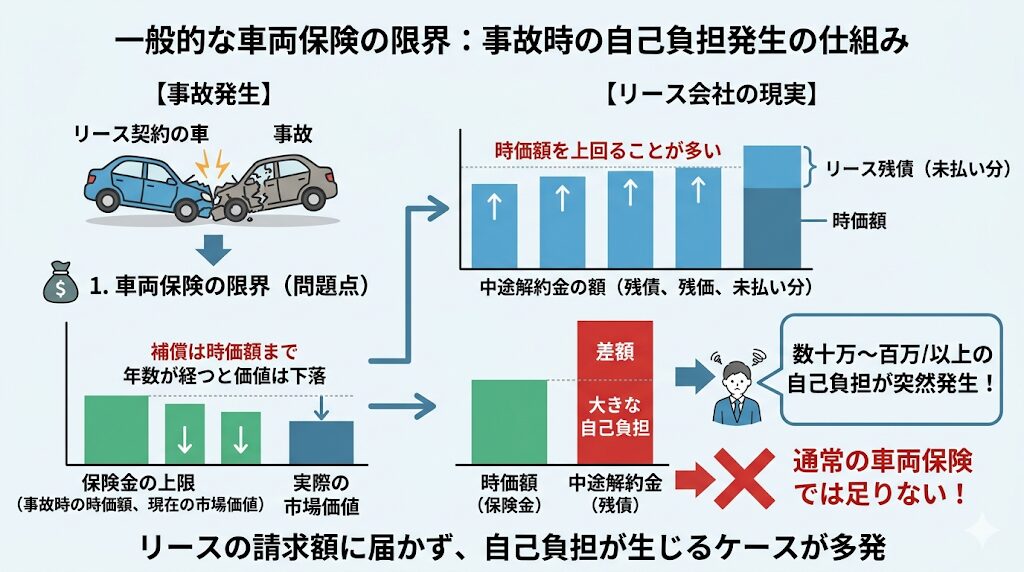 通常の車両保険に入っていたとしても、支払われる保険金は「事故に遭った時点での車の時価額(現在の市場価値)」が上限となります。そのため、リース会社から請求される中途解約金の額に保険金が届かず、足りない分として数十万円から百万円以上の自己負担が突然発生するケースが多発しているのです。