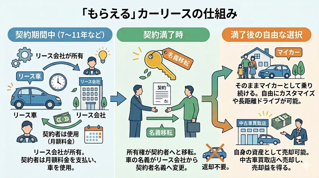 そうした「愛着・所有層」が選ぶべき正解は、リース契約でありながら最終的にマイカーとなる「もらえるプラン(譲渡型リース)」一択です。