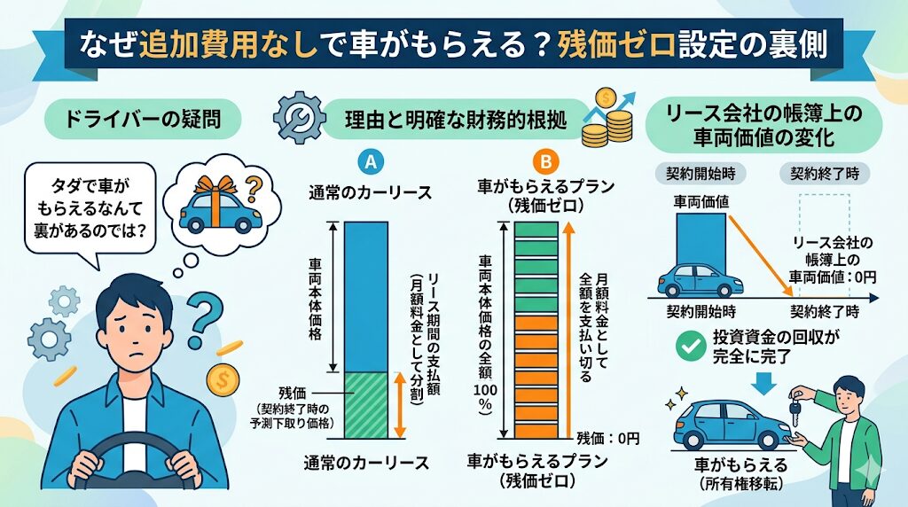 「タダで車がもらえるなんて裏があるのではないか」と疑問に感じるドライバーも多いかもしれません。車が追加費用なしでもらえる理由は、リース会社が契約の段階で残価を「0円」に設定しているという明確な財務的根拠があるためです。