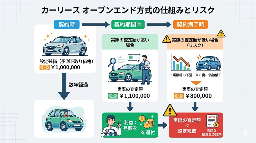オープンエンド方式は、契約時に残価を公開し、契約満了時の実際の車の査定額と、設定していた残価との差額を精算する仕組みです。