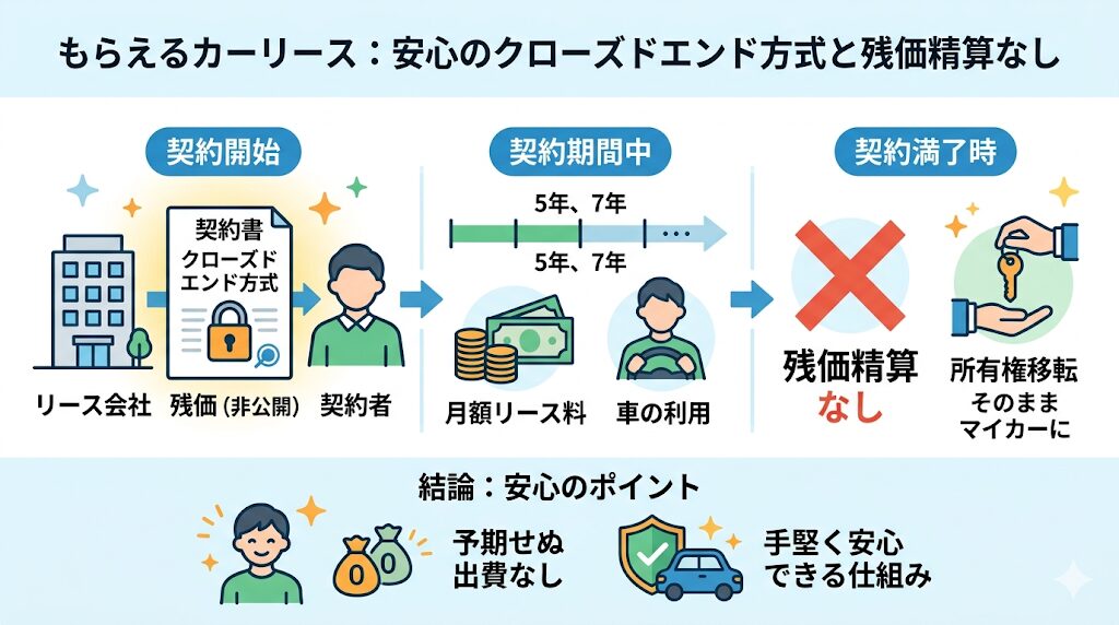 一方、クローズドエンド方式は残価を公開せず、満了時の残価精算も一切行わない契約方式です。もらえるカーリースの場合、最終的に所有権が移転するため「残価精算」の概念そのものが存在しなくなるか、あるいはベースとなる契約がクローズドエンド方式であることが一般的です。