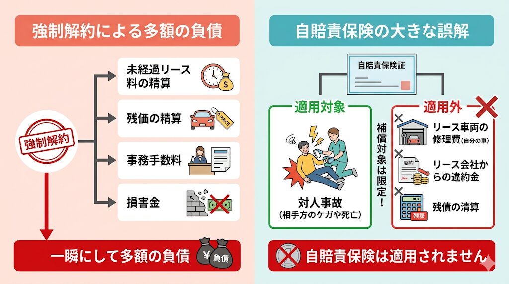車が修理不可能な状態(全損)になると、リース契約は継続できず「強制解約」となります。この際、未経過分のリース料金や残価などを合わせた莫大な違約金が一括で請求されます。