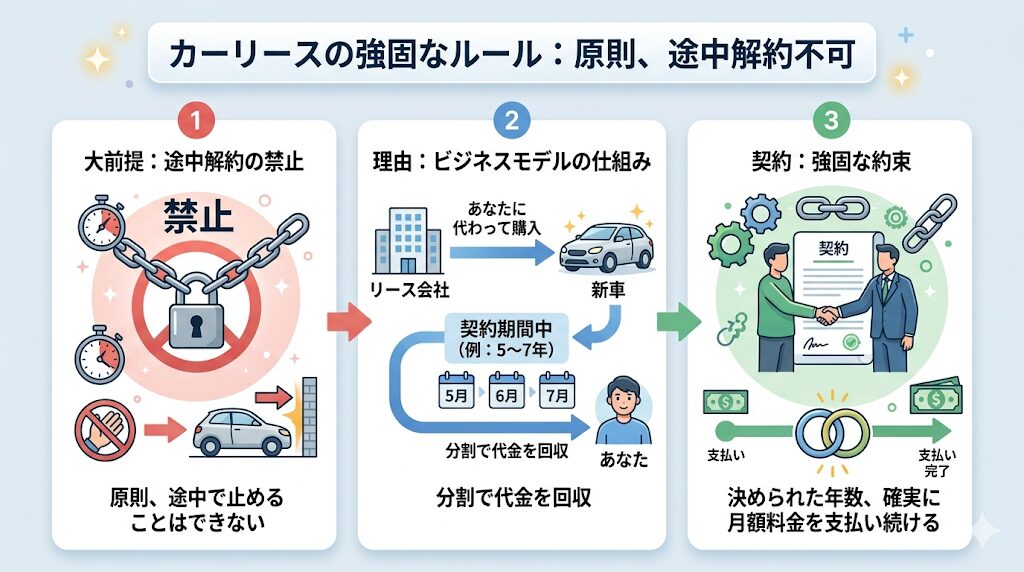 大前提として、一般的なカーリースは「原則として途中解約ができない」という厳しいルールがあります。