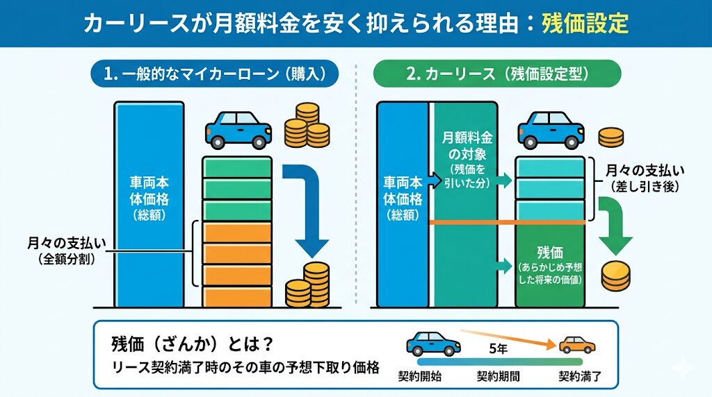 カーリースがマイカーローンなどと比べて、月々の支払いをとても安く抑えられる最大の理由は、「残価(ざんか)設定」という仕組みを採用しているからです。残価とは、簡単に言えば「リース契約が終わる時点での、その車の予想下取り価格」のことです。