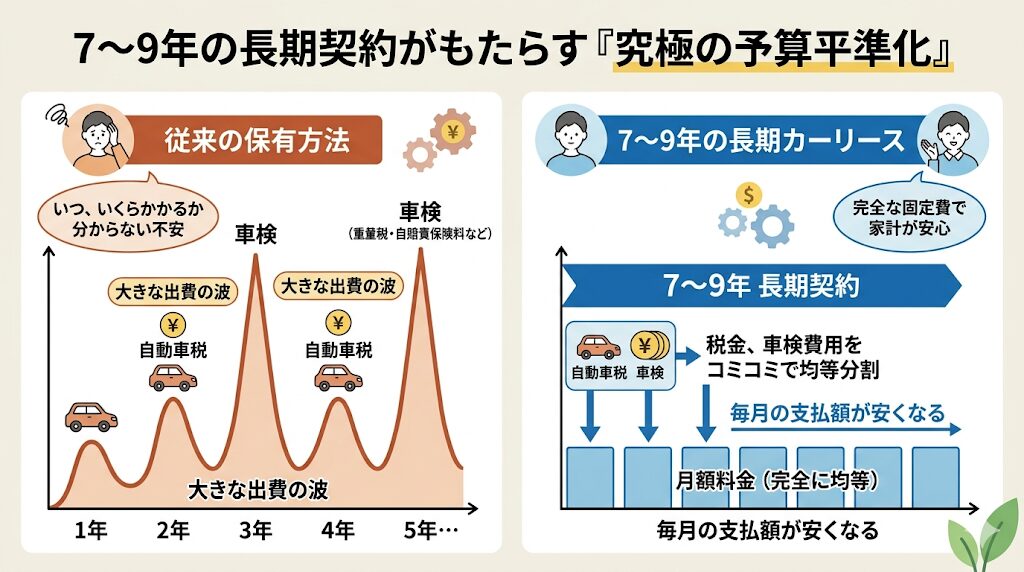 7年や9年という長期契約を結べば、毎年春にやってくる自動車税や、数年ごとの車検費用(重量税や自賠責保険料など)といった大きな出費の波を、すべて均等に分割することができます。