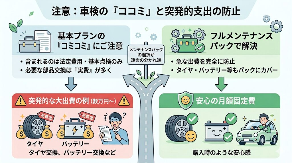 特に、数万円単位の出費となる「タイヤ交換」や「バッテリー交換」が月額料金に含まれているかどうかが、突発的支出を防ぐための大きな分かれ道となります。