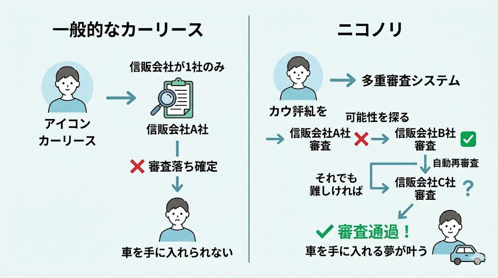 しかし、ニコノリの場合は「多重審査システム」を採用しています。これは、A社の審査に落ちてしまっても、自動的にB社の基準で再審査が行われ、それでも難しければC社へ…というように、ユーザーの希望に沿えるよう複数の会社で可能性を探ってくれる画期的な仕組みです。