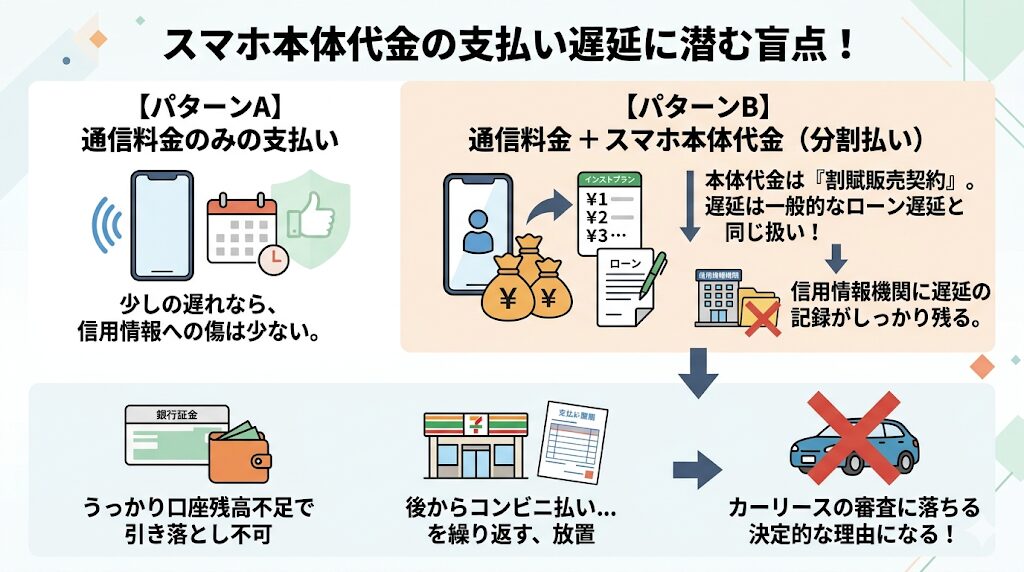 毎月の携帯電話の「通信料金」の支払いが少し遅れただけであれば、信用情報に致命的な傷がつくことはあまりありません。しかし、数万円から十数万円もするスマートフォン本体の代金を、毎月の通信料に上乗せして分割払いで購入している場合、その支払いの遅れは「一般的なローンの支払い遅延」とまったく同じ扱いとして信用情報機関にしっかり記録されてしまいます。