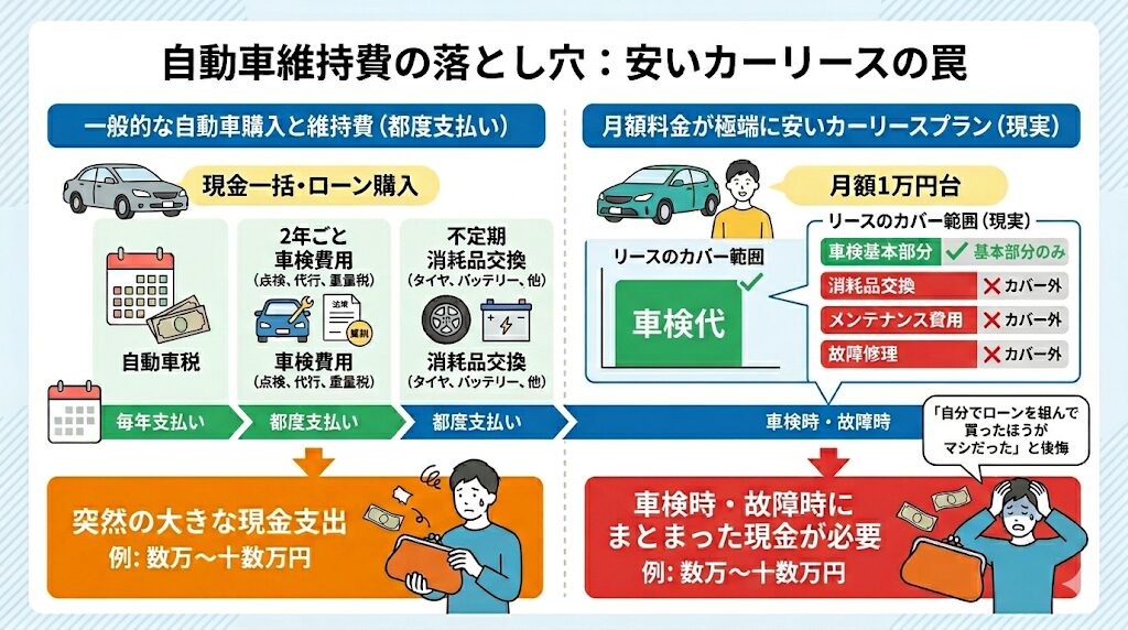 月額料金が極端に安いカーリースプランの多くは、こうした車検費用の基本部分のみしかカバーしておらず、消耗品の交換費用やメンテナンス費用が含まれていないケースが散見されます。目先の月額料金を1万円台に抑えられたと喜んでいても、結局は車検時や故障時にまとまった現金が必要となり、「これなら自分でローンを組んで買ったほうがマシだった」と後悔する事態に陥ります。