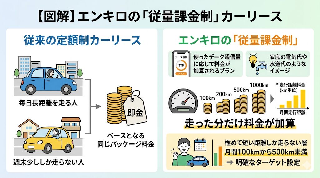 従来の定額制カーリースは、毎日長距離を走る人も、週末に少ししか走らない人も、ベースとなる同じパッケージ料金を支払う構造になっていました。しかしエンキロは、月間100kmから500km未満という極めて短い距離しか走らない層を明確なターゲットに設定しています。