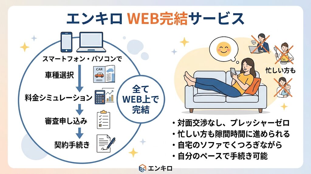 エンキロは、現代のライフスタイルに合わせて、車種の選択から料金プランのシミュレーション、審査の申し込み、そして最終的な契約手続きに至るまで、スマートフォンやパソコンを使ってWEB上で全て完結させることができる仕組みを整えています。