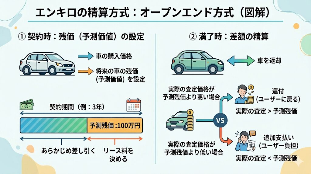 エンキロの契約形態は「オープンエンド方式」という精算方式を採用しています。 これは、数年間のリース契約が満了して車を返却する際、当初あらかじめ設定していた「車の残価(予測価値)」と、返却時の「実際の車の査定価格」を厳格に比較して、最終的な差額の精算を行う仕組みです。