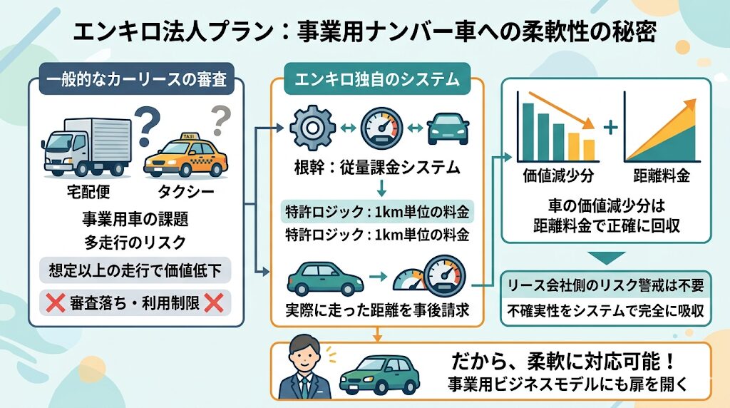 - 一般のリースでは断られやすい「事業用ナンバー」にエンキロが対応できる明確な理由