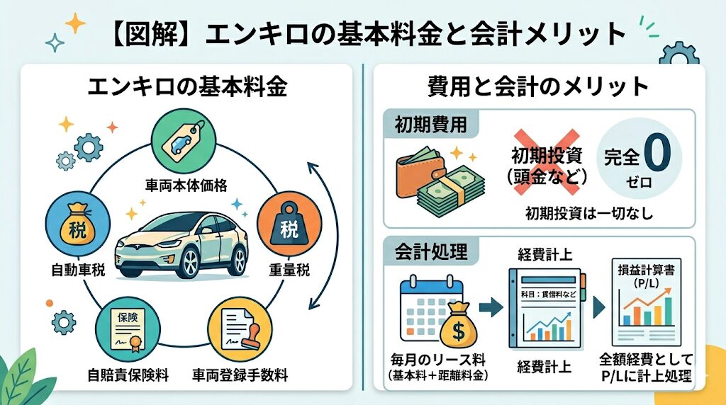 エンキロの基本料金には、車両本体の価格だけでなく、自動車税、重量税、自賠責保険料、そして面倒な車両登録手数料がすべてあらかじめ含まれています。つまり、車両を導入する際の頭金などの初期投資は完全にゼロであり、毎月のリース料(基本料+距離料金)は、そのまま全額「賃借料」などの科目で経費としてP/L(損益計算書)に計上処理することが一般的です。